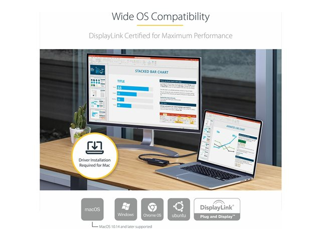 With an additional 4K monitor connected to your computer, you can extend or mirror your desktop for increased productivity. DisplayLink 4K Plug-and-Display certification ensures automatic driver installation, so you'll be ready to enjoy your Ultra HD display in no time.