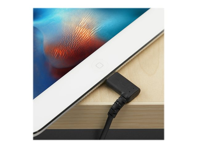 This angled Lightning to USB cable withstands the demands of charging and syncing your mobile devices. The angled Lightning connector gives you easy access to your mobile device, even while charging. And, and the longer cable is ideal for overcoming distance restrictions.