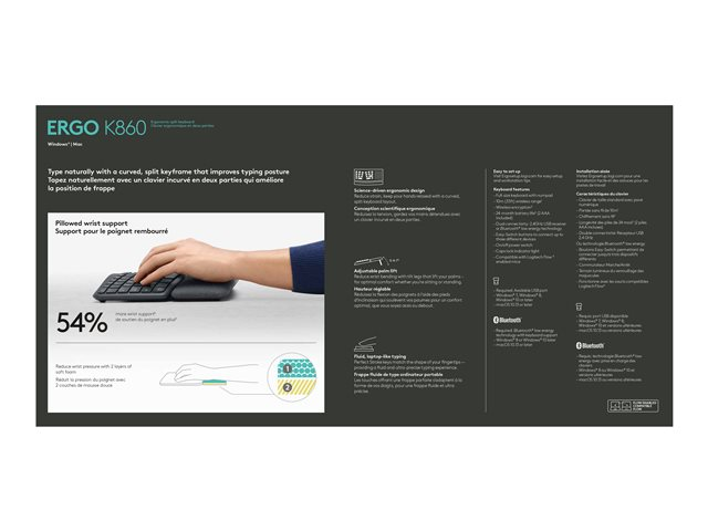 ERGO K860 er et delt ergonomisk tastatur som er utviklet for bedre holdning, mindre belastning og mer støtte. Du skriver naturlig på en buet, delt tasteramme som forbedrer skriveholdningen din. Den unike formen reduserer muskelbelastningen på håndledd og underarmer - hendene og skuldrene får en mer avslappet holdning.